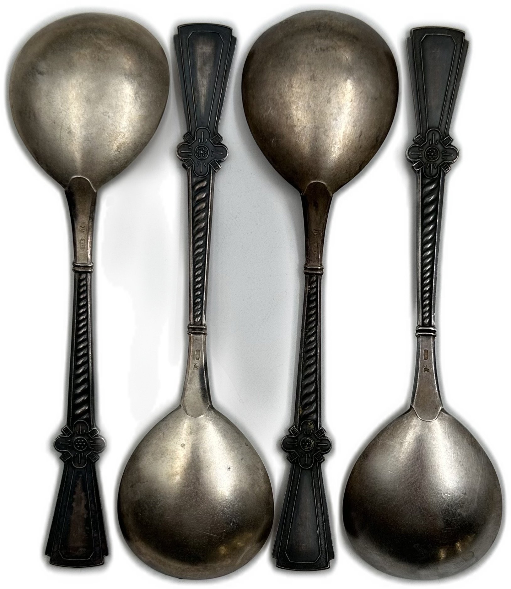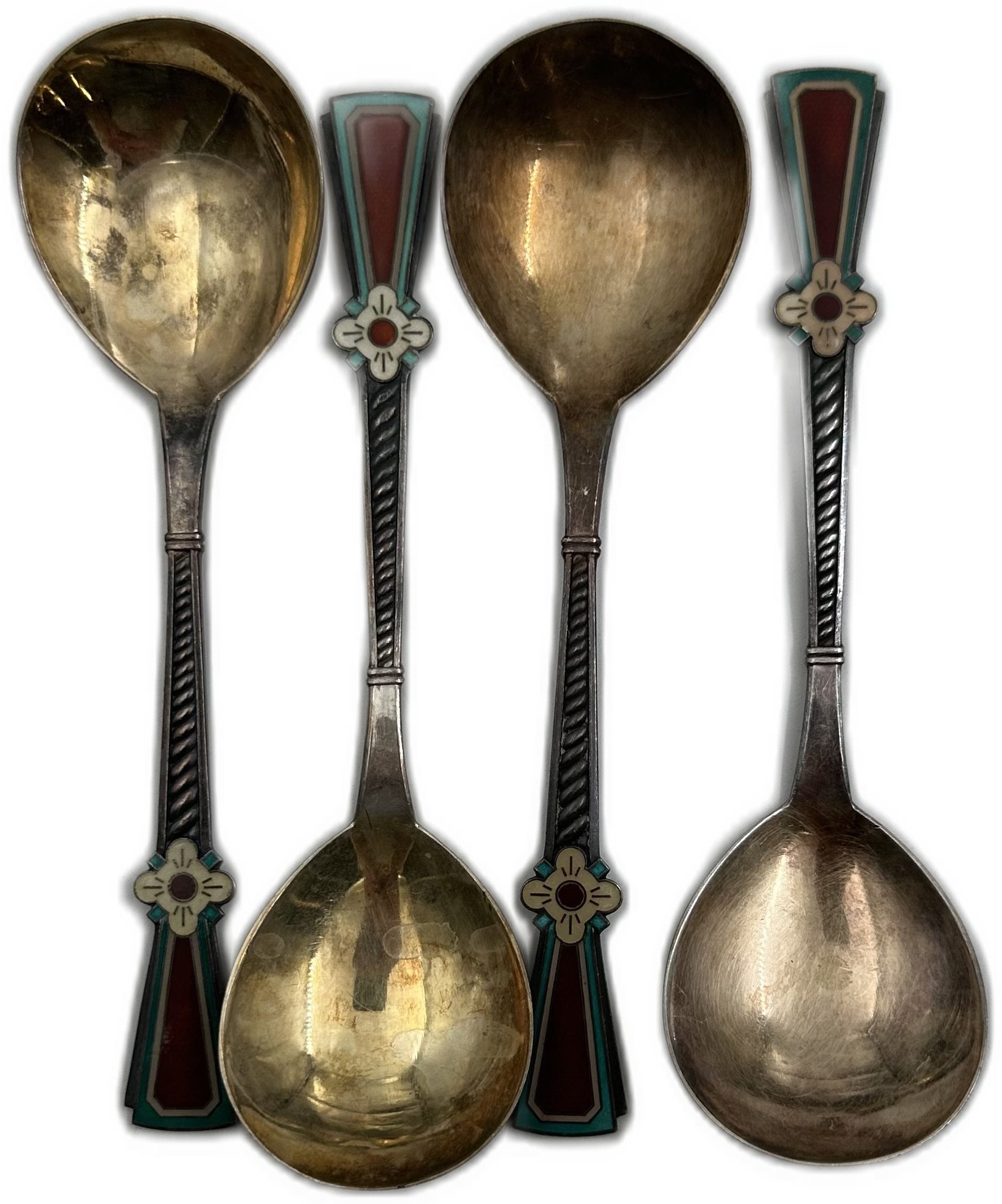 Серебро, общий вес 4-х ложек 182,9 грамм. Трехцветная эмаль, чернь, остатки золочения.