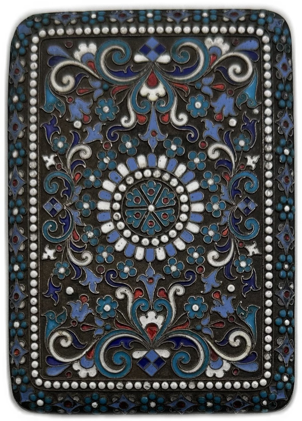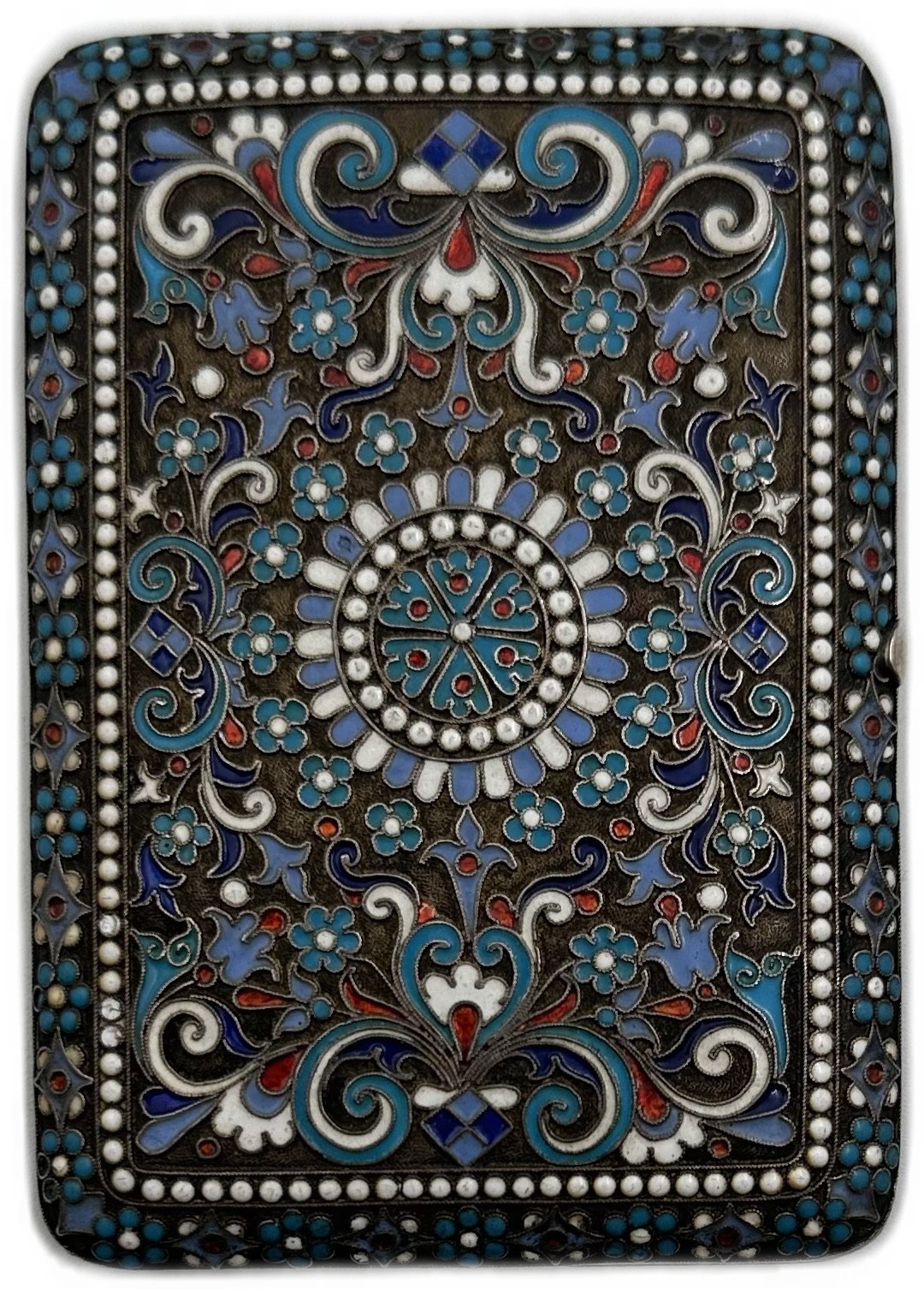 Серебро, общий вес 155 грамм. Штамп, снаружи растительны орнамент в технике перегородчатой эмали 5-и цветов. Внутри золочение, кнопка рабочая.