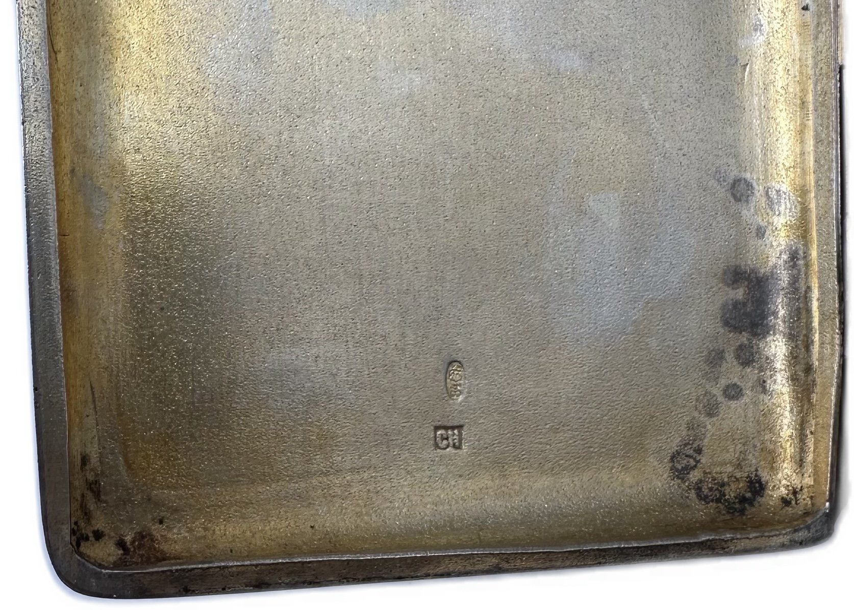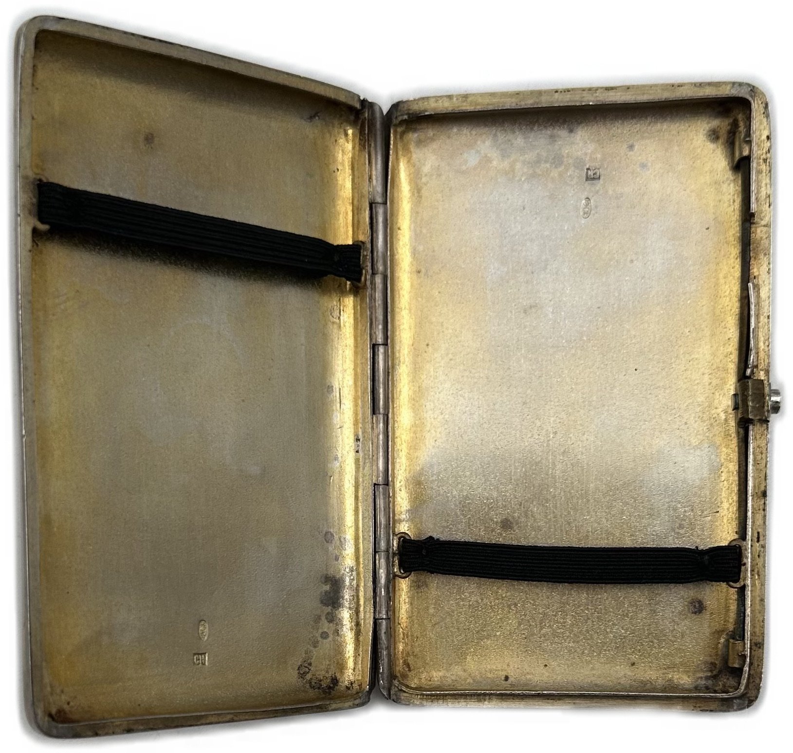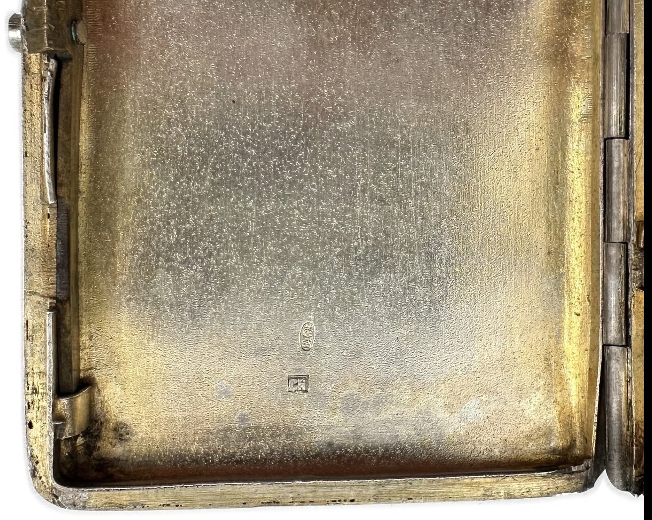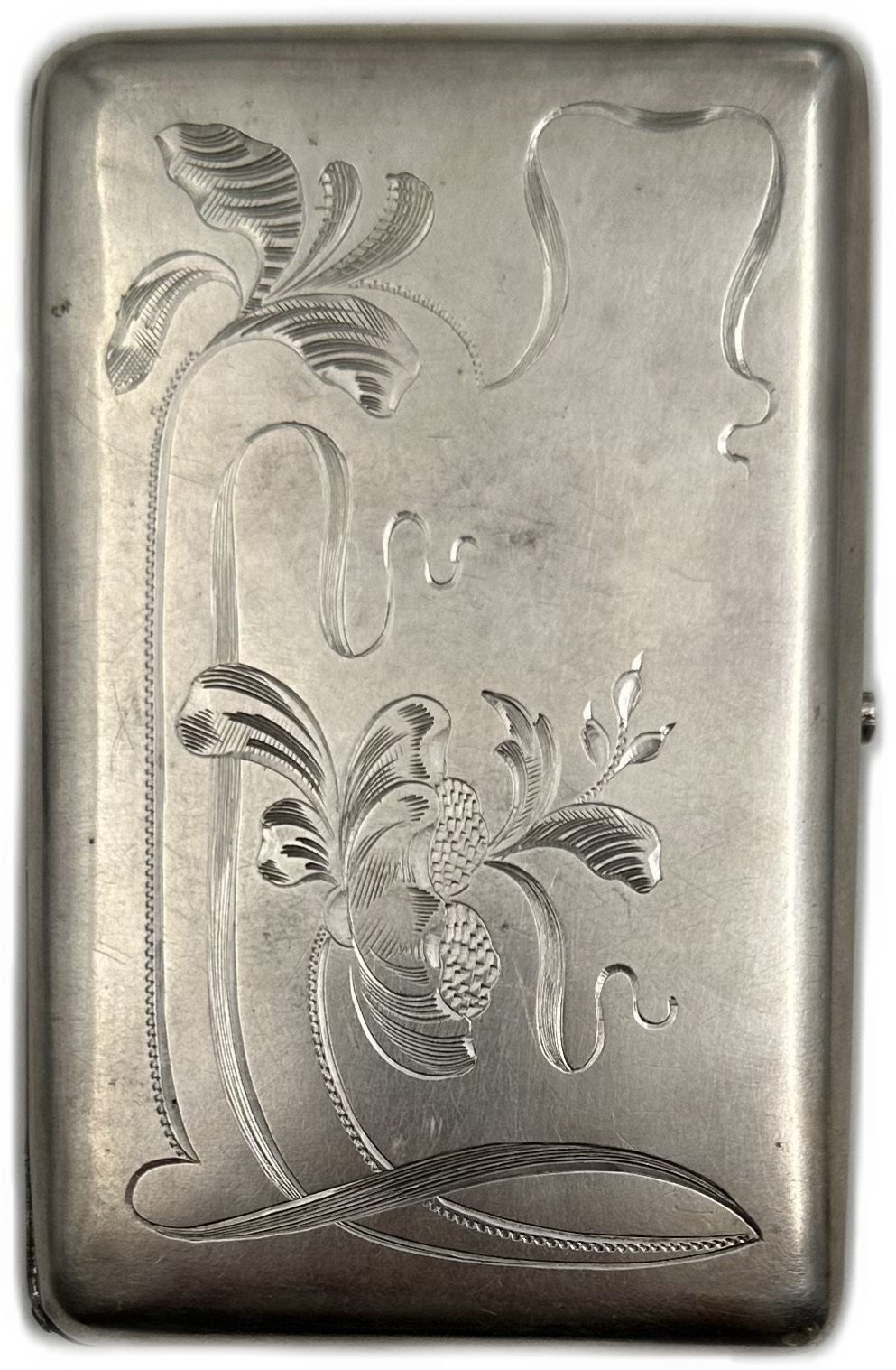 Серебро, общий вес 133 грамм. Штамп, снаружи штихелем нанесен цветочный орнамерт. Золочение внутри, кнопка рабочая.