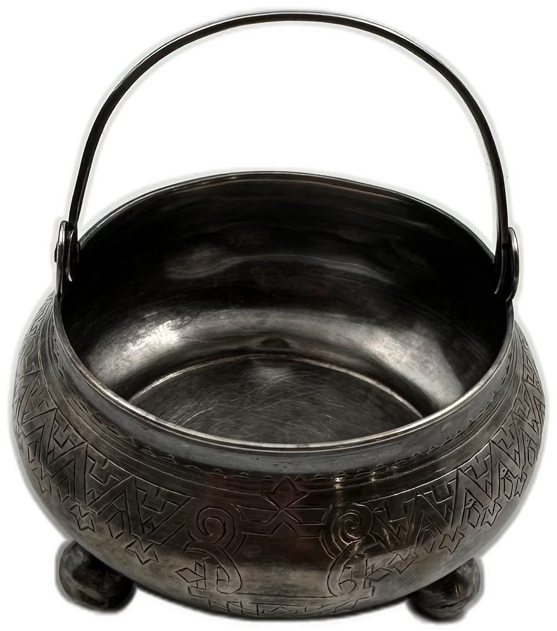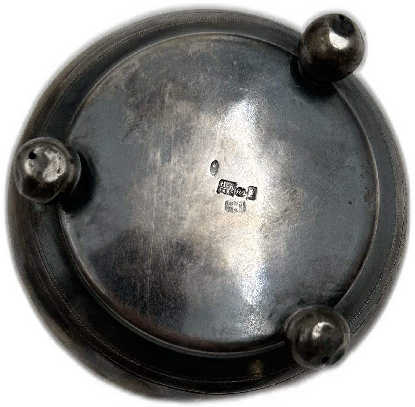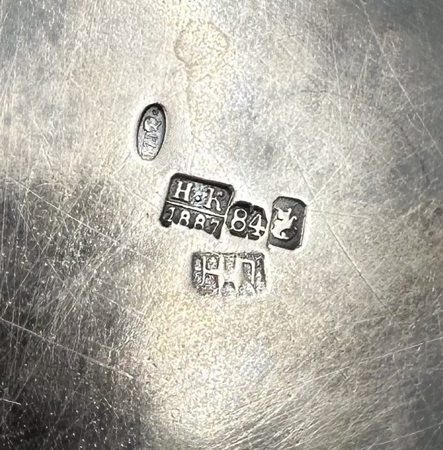 Пять клейм на дне: Н.К 1887, 84, Женская голова вправо 875, Н.П, Всадник на коне поражающий змия.