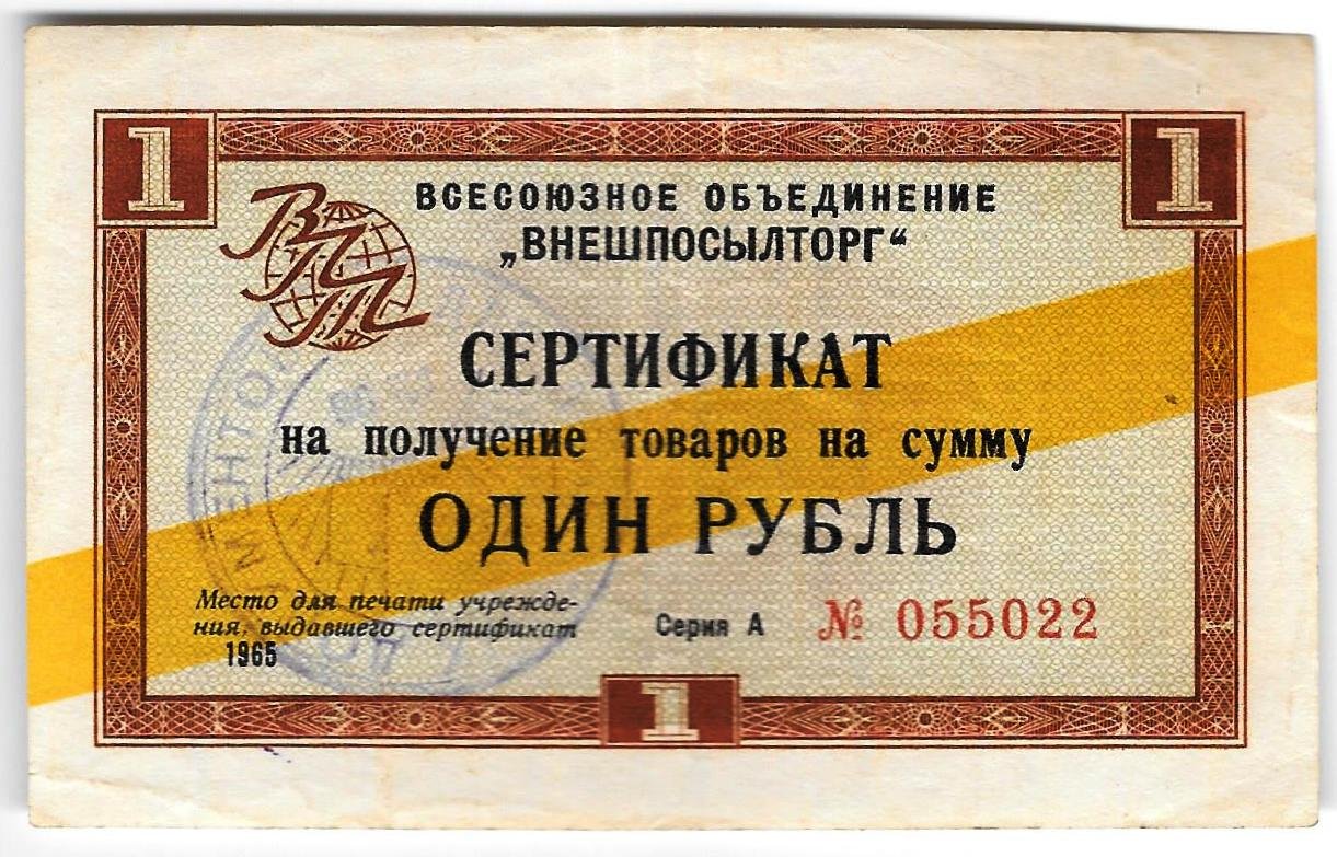 Сертификат (чек) 1 рубль 1965 Внешпосылторг синяя полоса