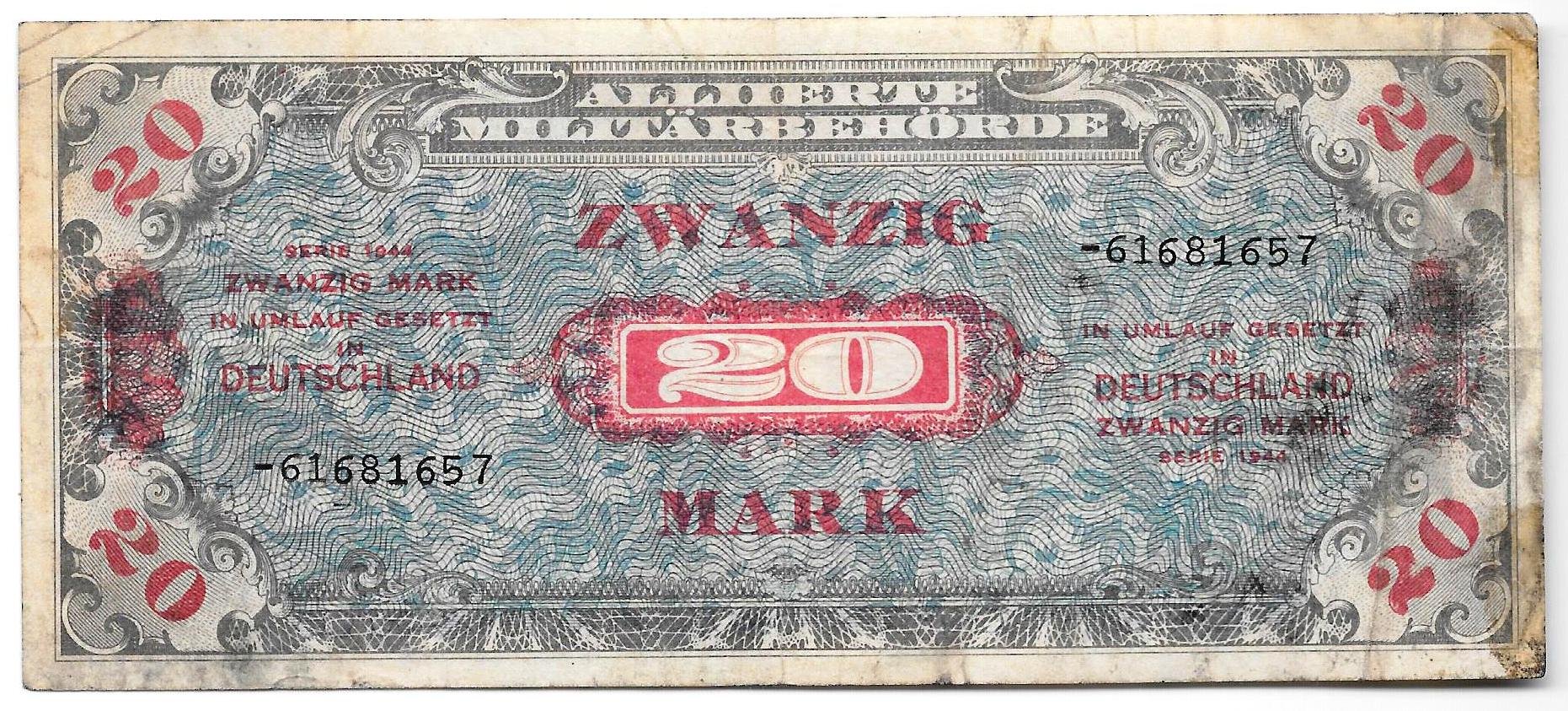 фото для Банкнота 20 марок 1944 Германия Третий рейх Оккупация Союзными войсками СССР Аверс