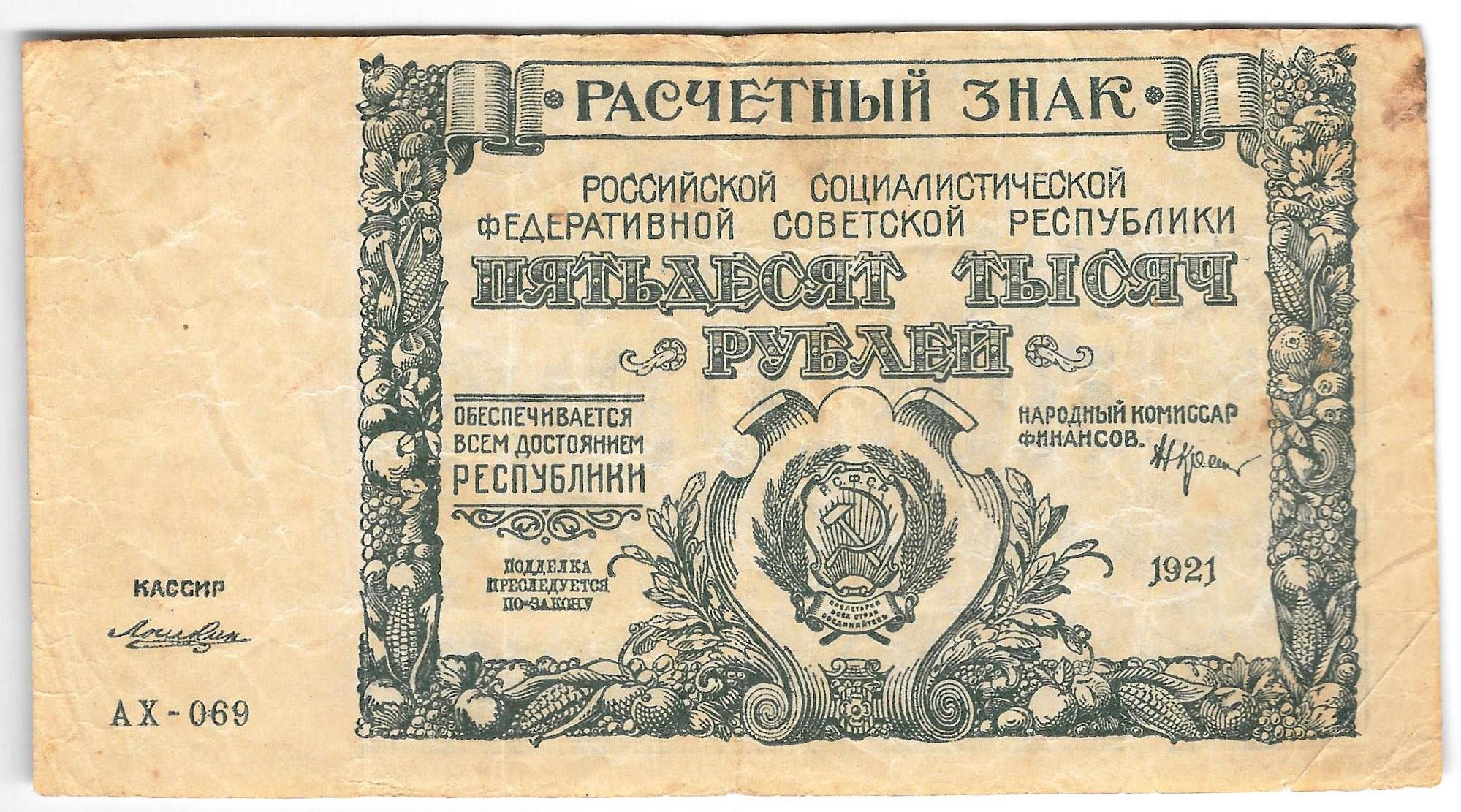 Банкнота 50000 рублей 1921 Дюков