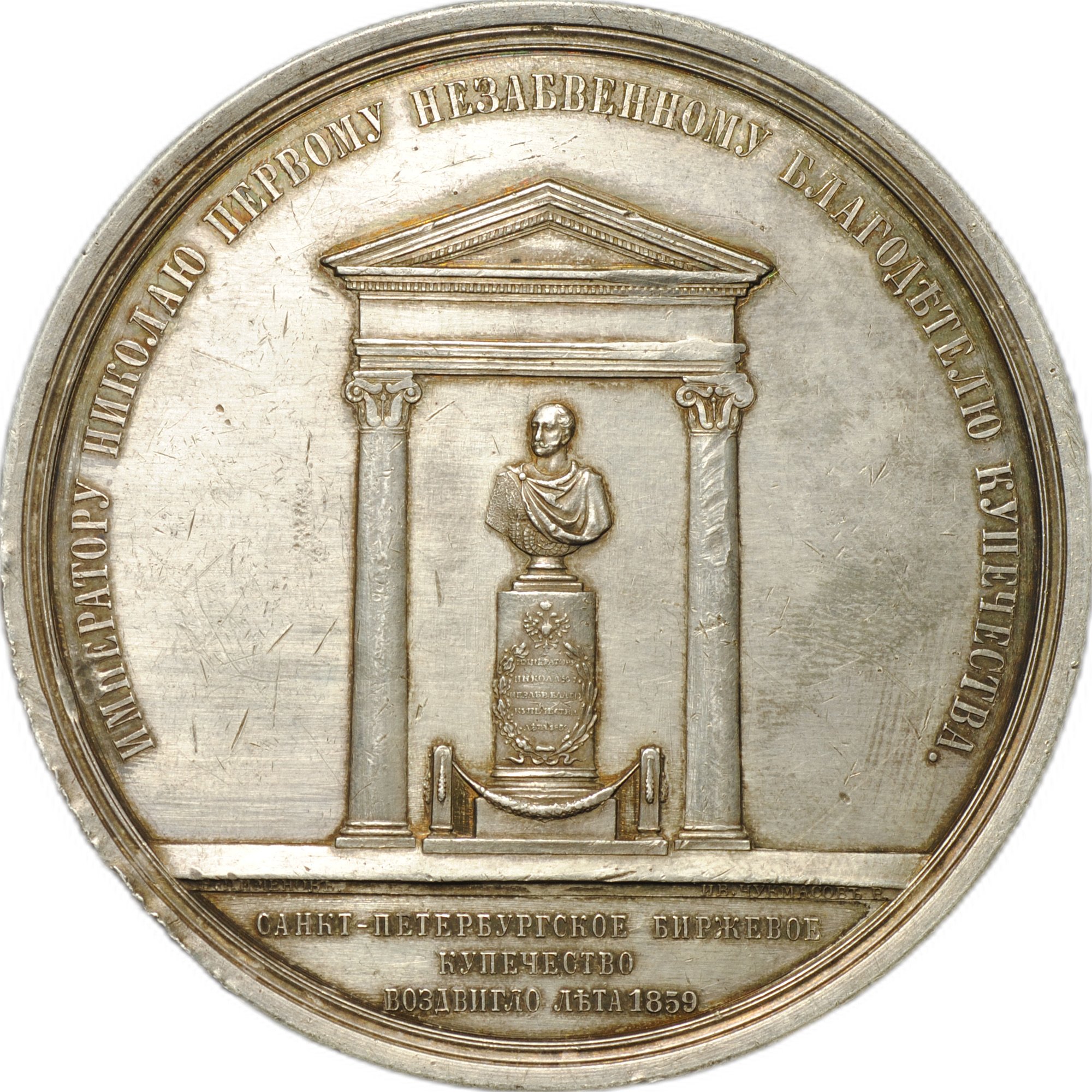Медальер И. Чукмасов. На лицевой стороне на линии обреза изображения слева подпись: «Н.ПИМЕНОВЪ.», справа: «ИВ.ЧУКМАСОВЪ Р.»; на оборотной стороне на линии обреза изображения, посередине: «ИВ.ЧУКМАСОВЪ Р.»