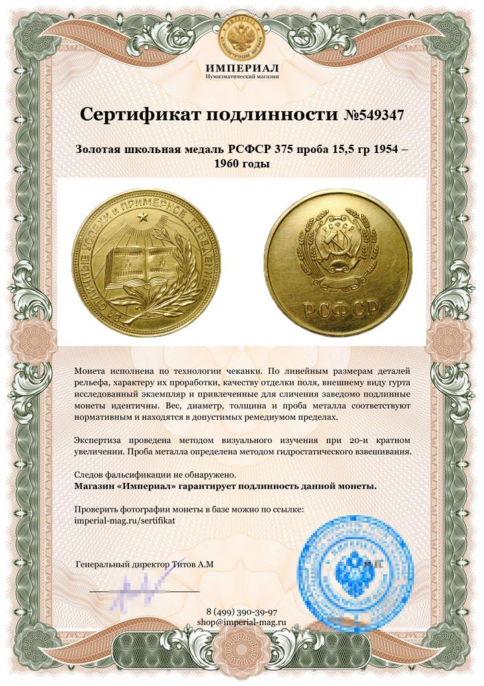 Золотая медаль за успешное окончание средней школы РСФСР «За отличные успехи и примерное поведение» образца 1954–1960 гг.