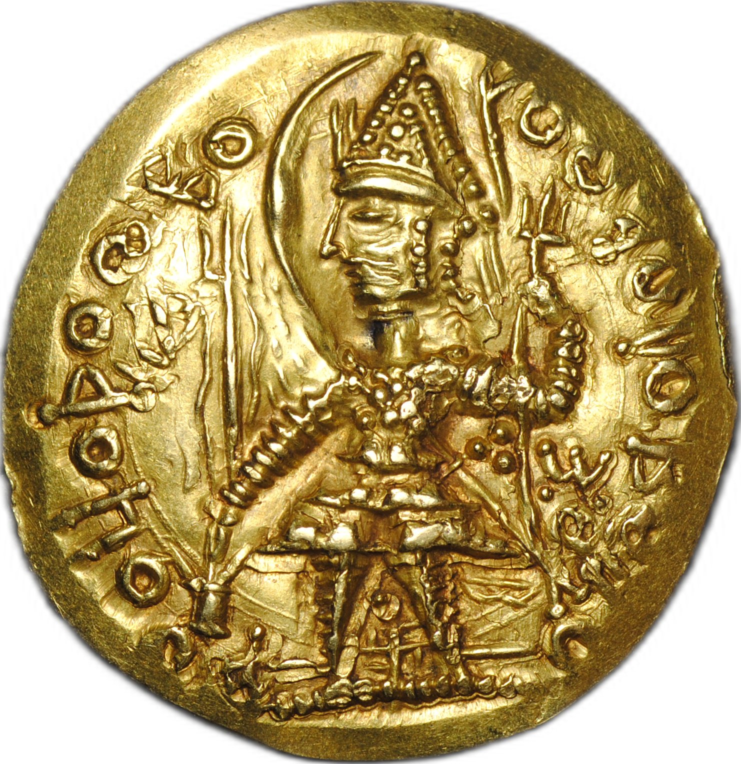 Царь Васудэва стоит, голова влево в шлеме, нимб слева. Доспех в сасанидском стиле, пламя на плечах, на поясе меч, трезубец в левой руке, правой рукой совершает жертвоприношение над алтарем, слева трезубец.