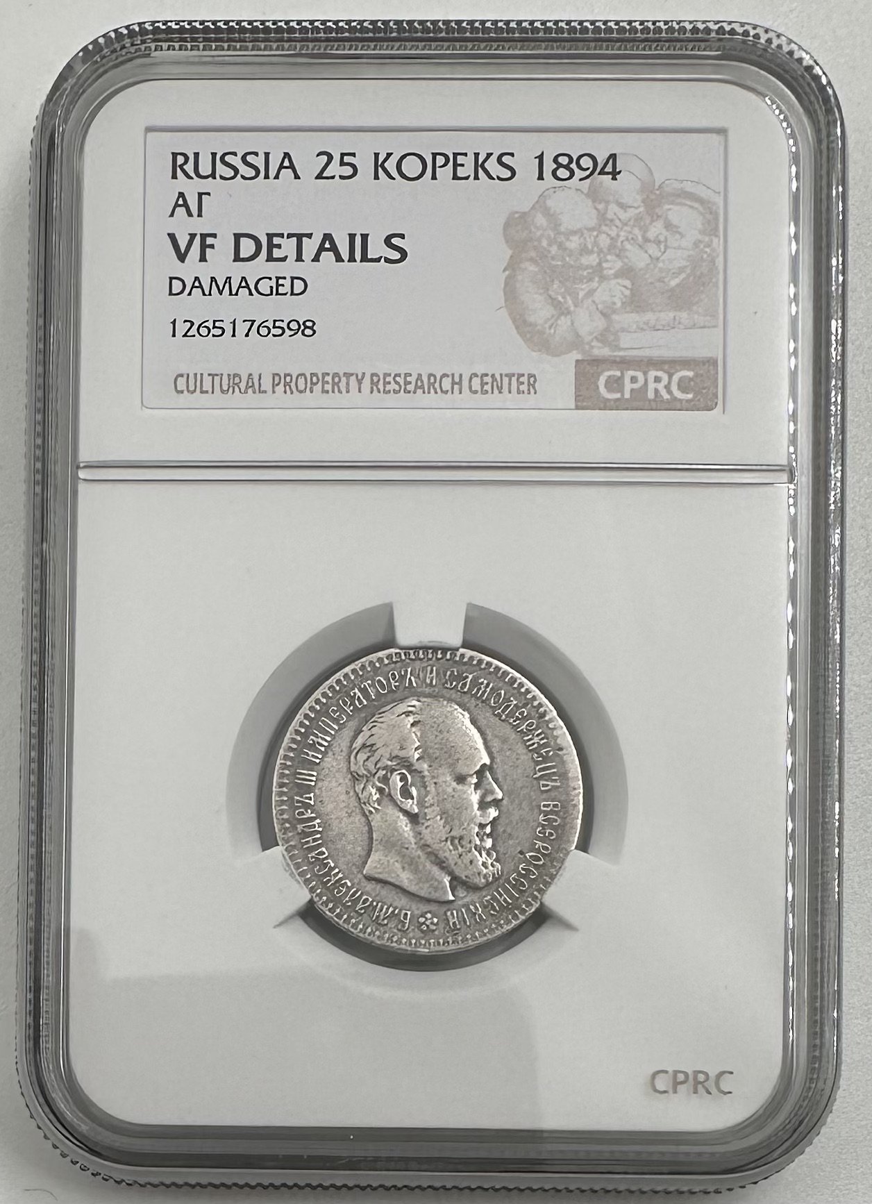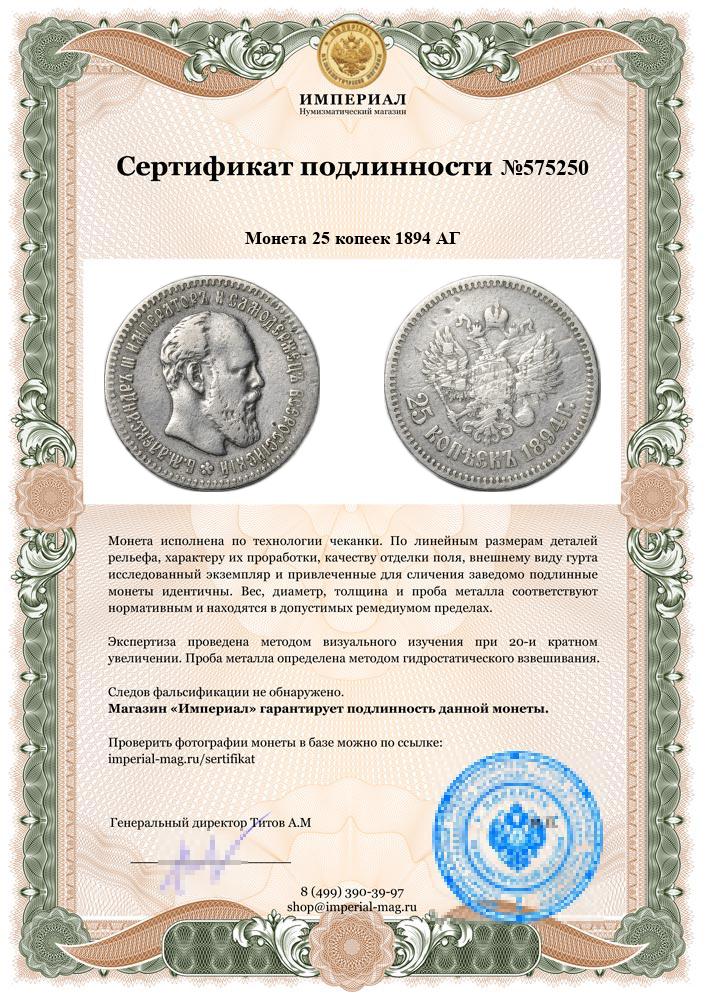 Монета 25 копеек 1894 АГ слаб CPRC VF Det.