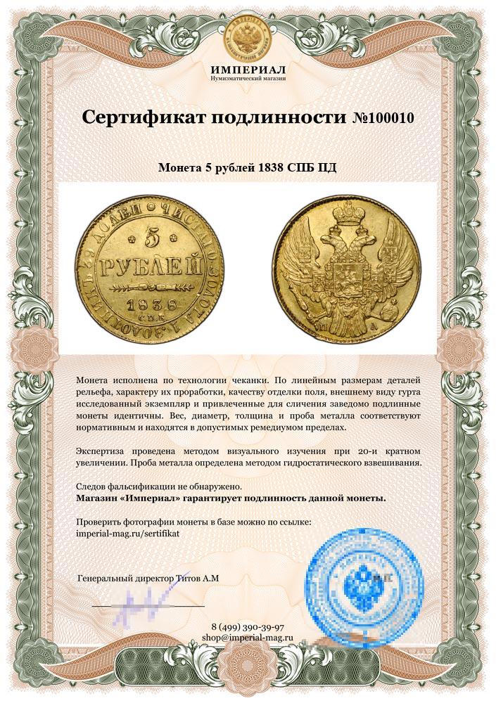 Монета 5 рублей 1838 СПБ ПД