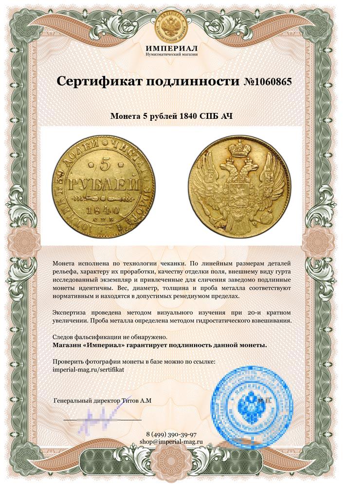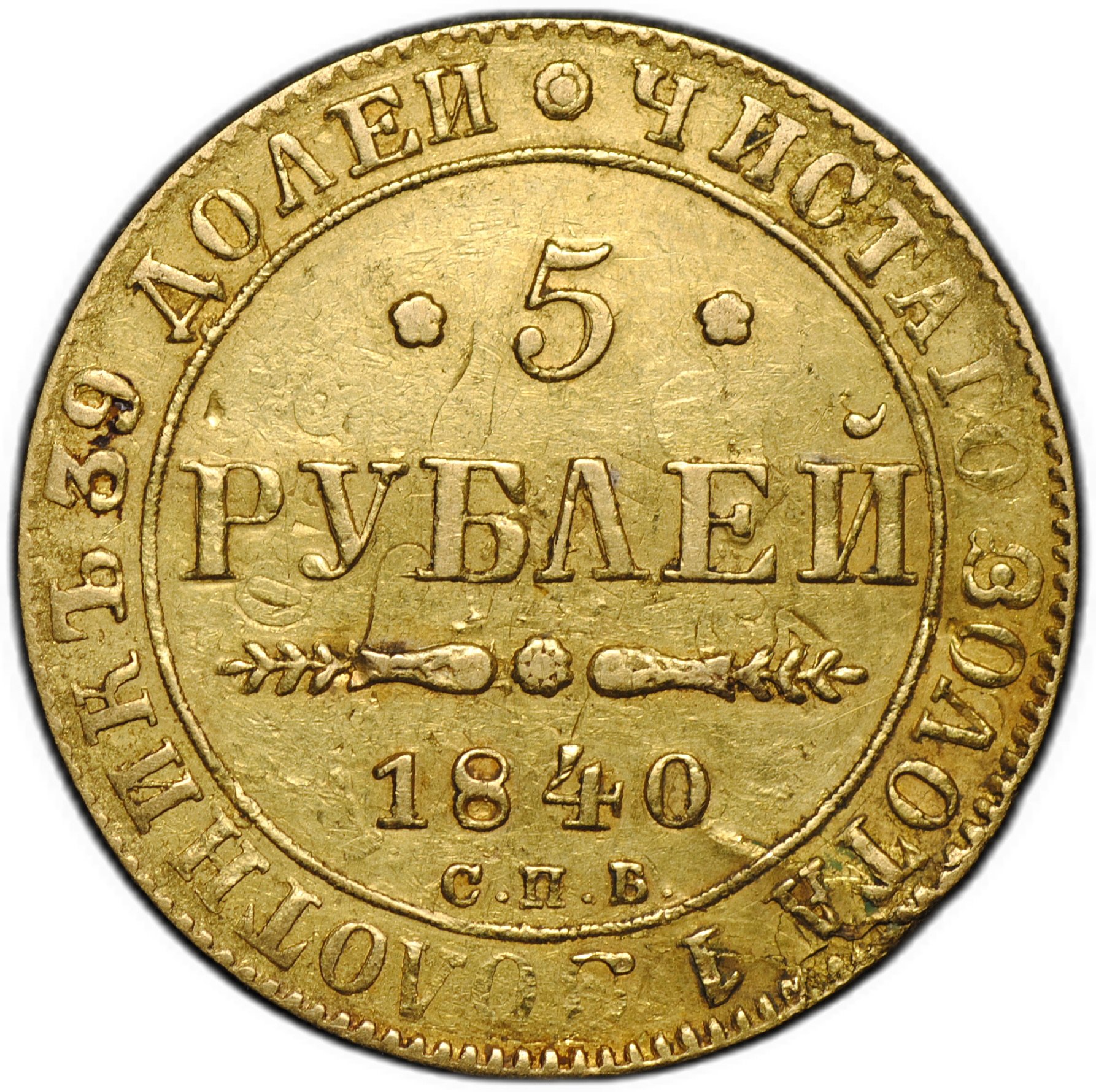 Перечекан / двойной удар с разворотом на 100 градусов. Отчетливые следы первого удара на реверсе: дата 1840 и цифра номинала 5.