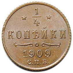 Монета 1/4 копейки 1909 СПБ