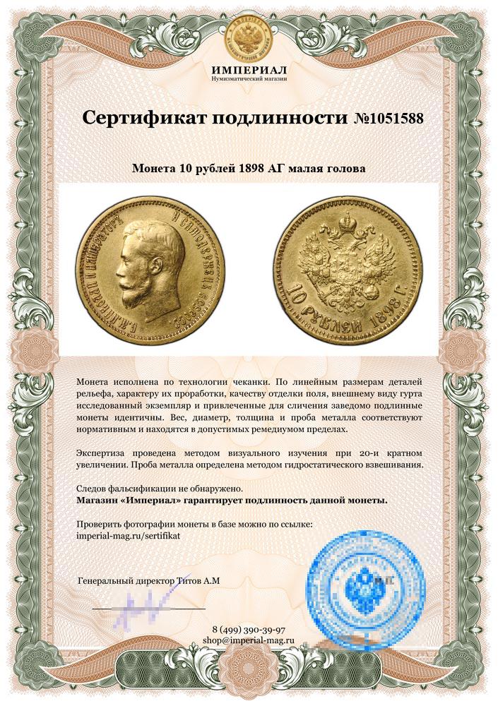 Монета 10 рублей 1898 АГ портрет ранний