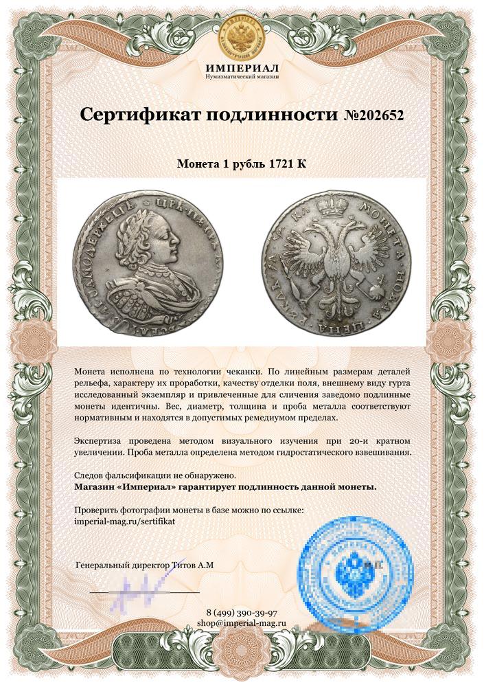 Монета 1 рубль 1721 К
