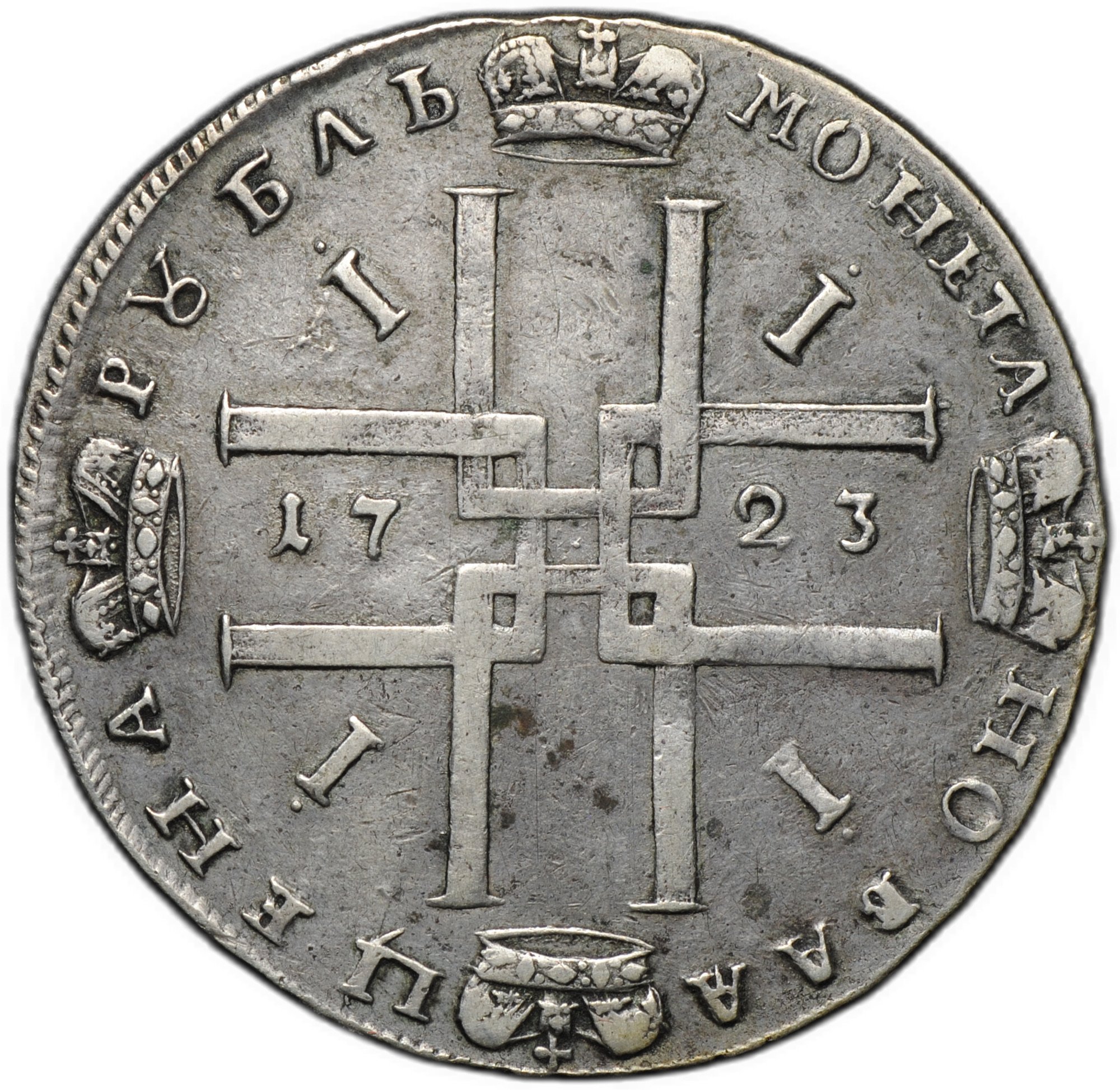 Аверс: малый Андреевский крест, над головой точка, ошибка в легенде NМПЕРАТОРЬ
