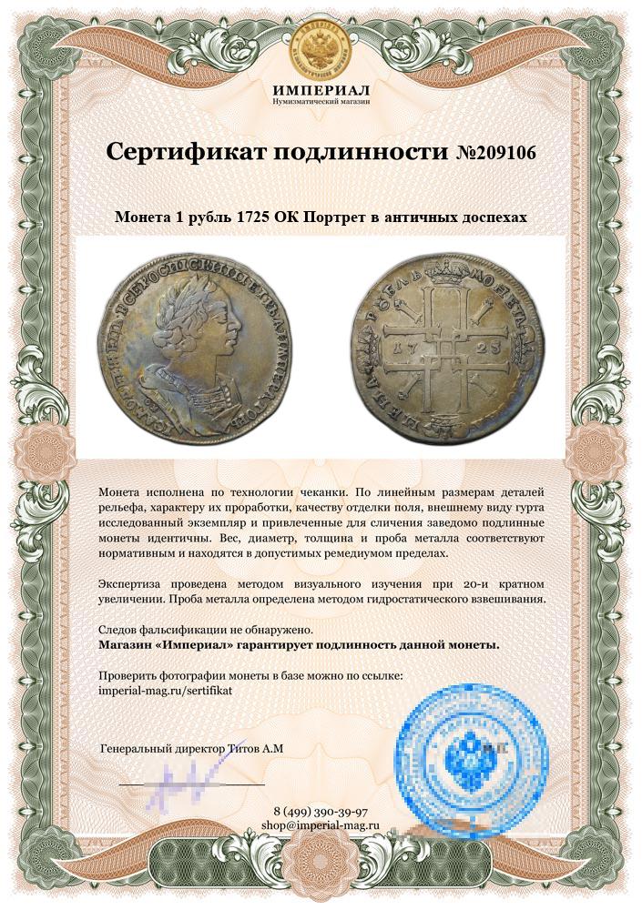 Монета 1 рубль 1725 ОК Портрет в античных доспехах слаб ННР AU 53