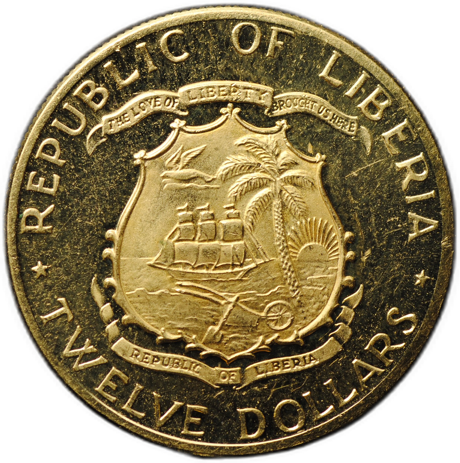 Аверс REPUBLIC OF LIBERIA THE LOVE OF LIBERTY BROUGHT US HERE REPUBLIC OF LIBERIA * TWELVE DOLLARS *